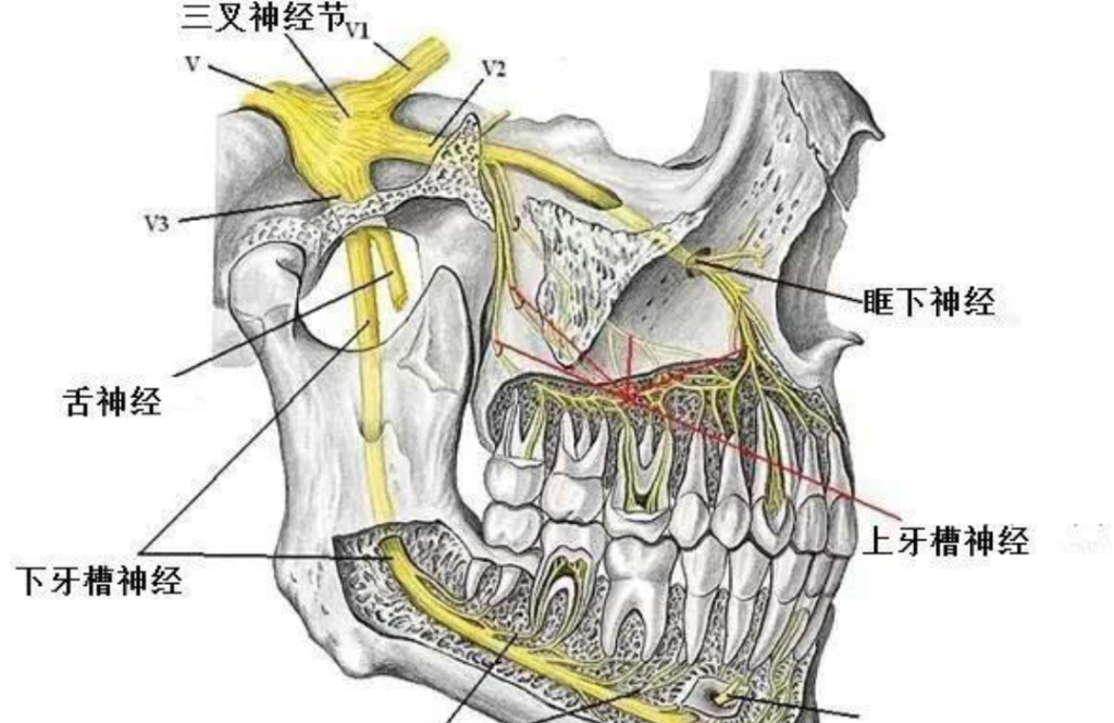 三叉神经为第五对脑神经,其第三支——下颌神经(V3)经卵圆孔出颅后分出下牙槽神经(inferior alveolar nerve, IAN),该神经经下颌孔进入下颌管,沿途支配下颌牙齿、牙龈及下唇等区域。下牙槽神经走行于下颌骨内的神经管中,与第三磨牙(智齿)根尖解剖关系密切,二者之间的最短距离可小于1mm,甚至存在根尖穿入神经管的情况。